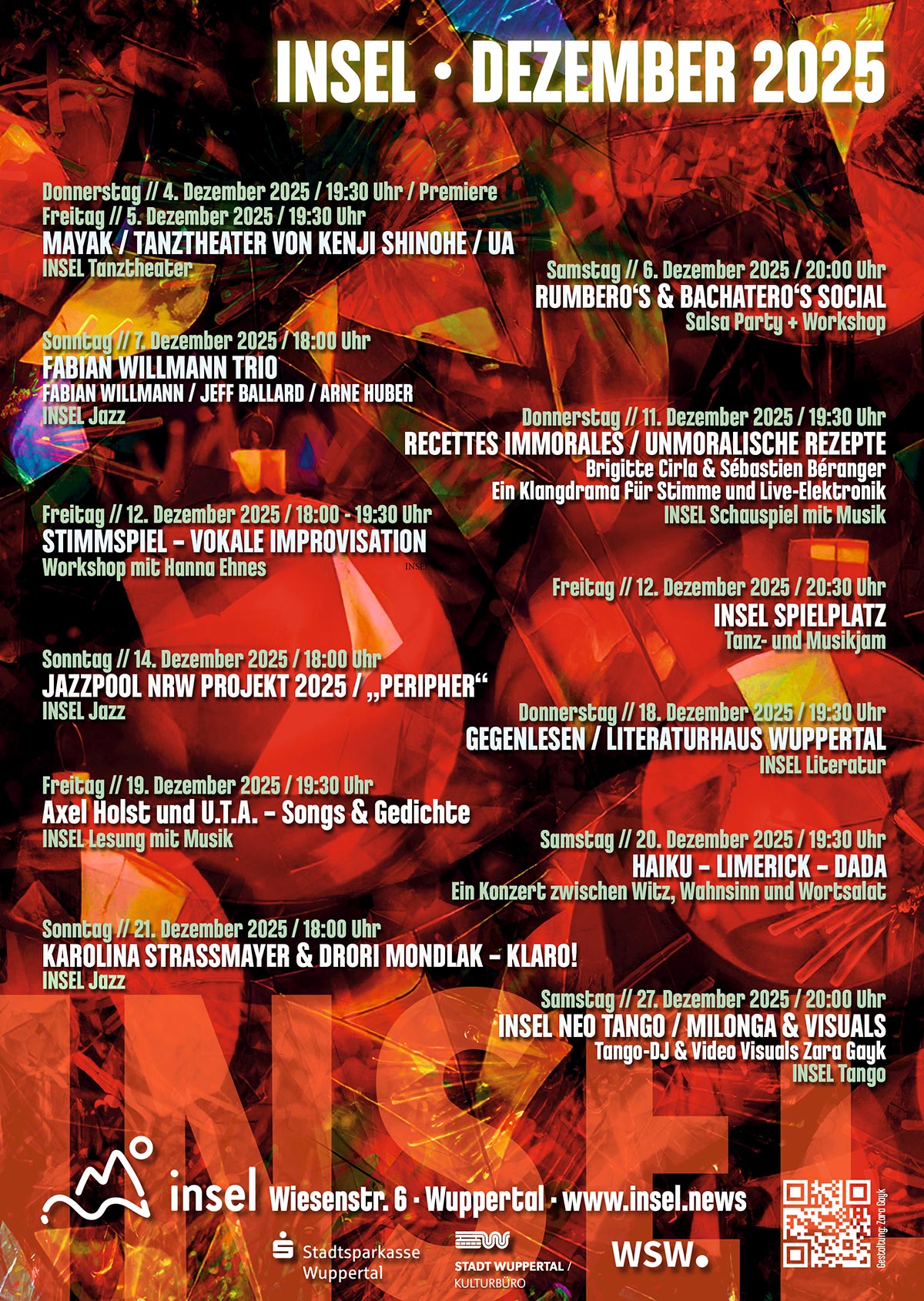 Es geht eine dunkle Wolk herein … oder die Kunst des Auf-hörens INSEL Jazz / Performance Donnerstag // 9. Januar 2025 / 19:30 Uhr / 19:00 Uhr Einlass Düstere Zeiten, die wir augenblicklich erleben … Zunehmende Gewalt im öffentlichen Raum, Klimawandel, schwindende Ressourcen, die Nachwirkungen der Pandemie, die Kriege in Europa und im nahen Osten und der bevorstehende Wandel der politischen und militärischen Weltordnung lassen Dunkles ahnen, wecken Angst, die lähmt, die wie eine dunkle Wolke das Leben verschattet, Hoffnungen und Ambitionen erstickt. Uli Johannes Kieckbusch / Sophia Otto / Tanja Kreiskott / Klaus Harms / Tanja Kreiskott / Günter Baby Sommer // v.l. // Fotos Elmar Petzhold Das Projekt "Es geht eine dunkle Wolk herein … oder die Kunst des Auf-hörens" nimmt diese Stimmung auf. Das mittelalterliche Lied ist dabei Spiegel und Ausblick zugleich. Dem Wesen nach ein Abschiedslied, beklagt es das Aufhören der bestehenden Zeit und scheint damit unser Gegenwartsgefühl zu bestätigen. Aber im Abschied liegt nicht allein Angst vor dem Aufhören, dem Ende. Im Abschied kann auch ein Aufbruch liegen, wenn man das "Auf–hören" tiefer versteht. Dem Auf-hören wohnt der Keim der Erneuerung inne. Auf-hören kann nur der, der loslässt, was er gerade tut. Auf-hören, auf etwas neues hören, kann nur der, der Abschied nimmt vom Gewohnten. Und immer liegen im Auf-hören eine Bewegung: das Auf! und ein Klang: das Hören. Naheliegend also, Bewegung/Tanz, mit Klängen/improvisierter Musik, zu verbinden. Auf! und Hören! – Die Welt ist voller alternativer Entwürfe und Experimente, die darauf warten, entdeckt zu werden. Sie ist voller oppositioneller Stimmen, die darauf warten, gehört zu werden. Auf diesem Weg kann lähmende Angst transformiert werden in gestaltende Kraft, in selbst wirksame Übernahme von Verantwortung, in phantasiereiche Krisenbewältigung. Es beginnt bei mir selbst oder es beginnt nicht. In fünf Szenen widmet sich das Ensemble dieser Transformation von der erstickenden Wolke zum Auf – Hören, zur Bewegung. BESETZUNG Günter Baby Sommer // Schlagzeug Sophia Otto // Tanz Uli Johannes Kieckbusch // Klavier Tanja Kreiskott // Querflöte / Fujara / Electronics / Stimme / Kostüm Klaus Harms // Kontrabass / Daxophon / Electronics Eine Veranstaltung der INSEL. Gefördert von der Intitiative Musik und der Beauftragten der Bundesregierung für Kultur und Medien. INSEL Jazz / Performance Donnerstag // 9. Januar 2025 / 19:30 Uhr Es geht eine dunkle Wolk herein … oder die Kunst des Auf-hörens Günter Baby Sommer / Sophia Otto / Uli Johannes Kieckbusch / Tanja Kreiskott / Klaus Harms Einlass: 19:00 Uhr Eintrittspreis EUR 18.00 / EUR 8.00 erm. / Vorverkauf EUR 20.00 / EUR 10.00 erm. / Abendkasse Tickets kaufen 4869 TAGs: INSELWuppertalTanzJazzKlavierKontrabassSchlagzeugStimmeTanztheaterPerformanceGünter Baby SommerSophia OttoUli Johannes KieckbuschTanja KreiskottKlaus HarmsQuerflöteFujaraElectronicsDaxophonKostüm