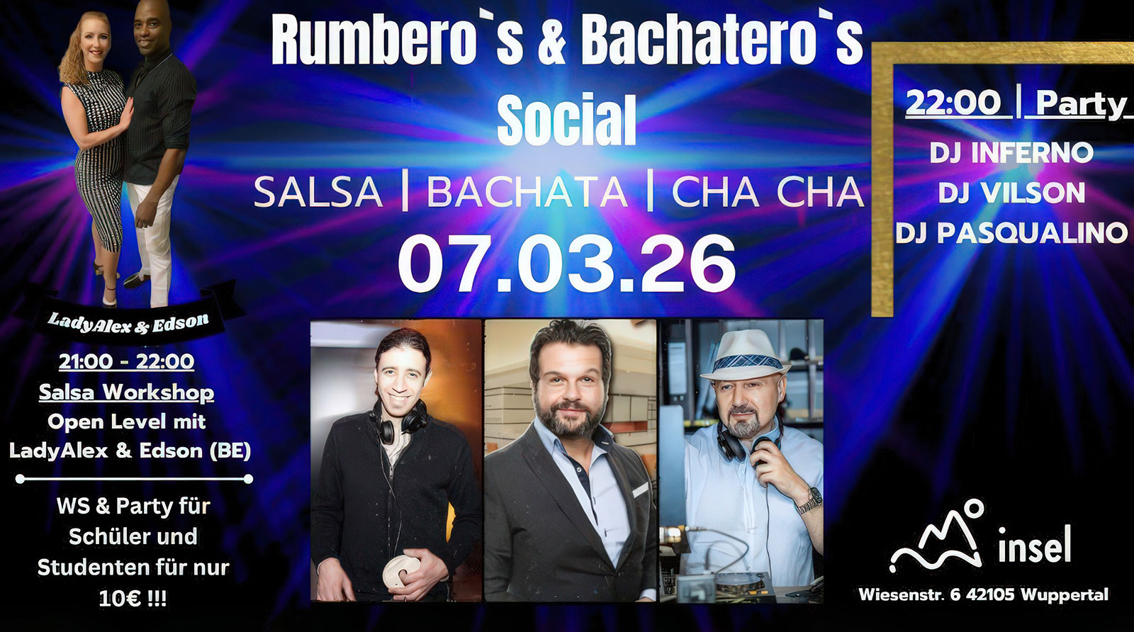 INSEL Salsa RUMBERO‘S & BACHATERO‘S SOCIAL Samstag // 7. März 2026 SALSA WORKSHOP 21:00 - 22:00 Uhr Mit Lady Alex & Edson / Open Level PARTY // BEGINN 22.00 Uhr mit DJ Inferno DJ Vilson DJ Pasqualino Eintritt im Vorverkauf Workshop + Party EUR 20.00 INSEL Salsa Party // INSEL Samstag // 7. März 2025 / 21:00 Uhr Rumbero's & Bachatero's Social // Party & Workshop Eintrittspreis EUR 20.00 pro Person / Kombiticklet Tickets kaufen Eine Veranstaltung der RUMBERO DANCE SCHOOL Alle Infos auf: www.Rumbero-Pasqualino.de Einladung zum 7. Februar 2026 Parkmöglichkeiten Parkplatz INSEL Parkplatz P1: Juliusstr. 12, (Über 200 Parkplätze). Parkplatz der Alten Glaserei auf der Nordbahntrasse. Bitte die Juliusstraße bis zum Ende durchfahren und dann rechts auf den Parkplatz abbiegen. Aussteigen, links am Marker Bahnhof an den Blumenkübeln entlang gehen, die Neue Friedrichstraße runter und dann links in die Wiesenstraße. Es sind ca 250 m zur INSEL! Parkplatz P2 (Adresse: Gathe 6), Hier könnt Ihr auf den Parkplätzen der Alten Feuerwache parken. Der Hausmeister weiß Bescheid! (ca 20 m zur INSEL) Unabhängig wo ihr parkt, Ladys, bieten wir Euch, wenn ihr unsere Party verlasst, einen Begleitservice zu Eurem Auto hin! Salsaklassen mit Pasqualino & Rachel Pasqualino & Rachel SALSA Kurse ANFÄNGER I Mittwochs ab 17:00 Uhr | Anfänger ohne Vorkenntnisse Dieser Kurs ist offen für alle Anfänger und Anfängerinnen ohne Vorkenntniss. Die Anmeldung per E-Mail unter salsa[at]insel.news oder hier klicken... Anmelden ANFÄNGER II Mittwochs ab 18:00 Uhr | Anfänger mit Vorkenntnissen Dieser Kurs ist für die Salsa-Schüler*innen geeignet, die bereits an dem ersten Kurs für Anfänger und Anfängerinnen ohne Vorkenntnisse teilgenommen haben. Die Anmeldung per E-Mail unter salsa[at]insel.news oder hier klicken... Anmelden MITTELSTUFE Mittwochs ab 20:00 Uhr | Mittelstufe Dieser Kurs ist für die Salsa-Schüler*innen geeignet, die bereits keine Anfänger und anfängerinnen mehr sind. Hier findet Ihr neue Anregungen und könnt Eure Kentnisse vertiefen. Die Anmeldung per E-Mail unter salsa[at]insel.news oder hier klicken... Anmelden FORTGESCHRITTENE Mittwochs ab 20:00 Uhr | Mittelstufe Dieser Kurs ist für die Salsa-Schüler*innen geeignet, die fortgeschrittene Tänzer und Tänzerinnen sind. Hier findet Ihr die Unterstützung Euren Tanz mit viel Freude weiter zu perfektionieren. Die Anmeldung per E-Mail unter salsa[at]insel.news oder hier klicken... Anmelden Mehr Informationen Rumbero Pasqualino – Salsa mit Pasqualino in Wuppertal 25557 TAGs: INSELSalsaRumberoBachateroBachataPasqualinoVilsonWorkshopOpen Level Weitere Informationen Rumbero PasqualinoSalsa mit Pasqualino in Wuppertal