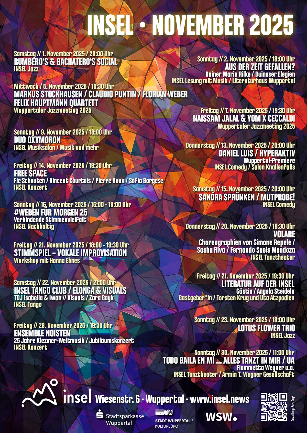 INSEL Tango Club TDJs Isabella & Iwan // NEOlonga / Elonga // Visuals / Zara Gayk Alle Farben des Tango mit Isabella & Iwan INSEL // 22. November 2025 / 18:45 – 20:45 Uhr Workshop mit Isabella & Iwan Die Posie der tanzenden Umarmung Isabella & Iwan / Die Posie der tanzenden Umarmung Tauche ein in die sinnliche Kunst der organischen Verbindung und entdecke, wie aus zwei individuellen Körpern eine verführerische, poetische Einheit entstehen kann. In diesem Workshop erforschen wir die prickelnden Geheimnisse des Abrazo – jener magischen Umarmung, die den Tango zu einem spielerischen Dialog der Verführung macht. Wir erkunden gemeinsam, wie sich die tanzende Umarmung von innen heraus entwickelt und dabei zu einem lebendigen, sinnlichen Flüstern zwischen zwei Seelen wird. Durch die bewusste Kultivierung dieser Verbindung öffnet sich ein Universum neuer Bewegungsmöglichkeiten – wie ein Kaleidoskop, das durch jede Veränderung der Umarmung neue Muster offenbart. Durch achtsame Körperarbeit und spielerische Experimente lernst du: Die natürliche Entstehung des organischen Abrazo als Quelle unendlicher Bewegungsvariationen Fließende Übergänge zwischen schmelzender Nähe und prickelndem Spiel mit Raum, die zu spontanen Figuren inspirieren Die Kommunikation durch zärtliche Berührung, aus der sich organisch neue Bewegungsmuster entwickeln Das sinnliche Spiel mit verschiedenen Qualitäten der Umarmung, die jeweils andere tänzerische Räume eröffnen Die Poesie der tanzenden Umarmung öffnet den Raum für authentische Begegnung voller Bewegungsreichtum und lädt ein, die schöpferische Kraft bewusster Verbindung zu erleben. Der Workshop bietet dir die Möglichkeit, deinen Tango durch die Magie der Umarmung mit einem unerschöpflichen Repertoire neuer Bewegungsqualitäten zu bereichern. Samstag // 22. November 2025 / 18:45 – 20:45 Uhr Anmeldung Paarweise / Kursgebühr 30,- € | p.P. Für Tangotänzer*innen aller Niveaus, die bereit sind, mit dem neugierigen Blick des Unverbrauchten zu experimentieren und zu erfahren: Aus Verbindung wird Bewegung – lass sie fließen! Anmeldungen per E-Mail bitte an ➜ tangoclub@insel.news INSEL // 22. November 2025 / 21:00 Uhr INSEL Tango Club Wieder in echter Umarmung! INSEL Tango Club © Iwan Harlan Mit Tango in allen Farben! elonga deep tango // tradionell / nuevo / non TDJ Isabella & Iwan Isabella & Iwan laden euch ein zu einer intensiven Reise durch ihre Tango-Welt, begleitet von den fantastischen Visuals von Zara Gayk! Was euch erwartet: Der elonga Insel Tango Club – ein Zufluchtsort für Seelen, die im Tango ihre Freiheit finden. Hier verschmelzen zeitgenössische Klänge in einem atemlosen Tanz der Gegenwart, ein Genussraum für den Tango von heute und morgen. Ein Laboratorium der Bewegung, das die Frage lebendig hält: Wohin entwickelt sich der Tango in unserer Zeit? Was blüht aus seinen Wurzeln neu? Unter Deinen Füßen: ein TANZBODEN WIE KEIN ANDERER – schwingend, mit perfektem Gripp, ein lebendiger Partner, der Deine Bewegungen aufnimmt und zurückgibt. Jeder Schritt wird zur Poesie, jede Drehung zum fließenden Vers eines Gedichts, das Dein Körper schreibt.Die Luft vibriert vom HERVOERRAGENDEM SOUND, der den Raum durchflutet – kristallklar, in Hi-Fi-Qualität, die jede Note, jeden Herzschlag der Musik spürbar macht. Hier erklingt Tango ab 1950 in all seinen Facetten: zeitgenössische Interpretationen klassischer Stücke, verführerischer Elektrotango, jazzige Improvisationen und swingige Milongas, die die Füße wie von selbst in Bewegung setzen. Die VISUELLEN PROJEKTIONEN umhüllen dich wie ein schützender Kokon aus Licht und Farben, verschmelzen mit der Musik zu einer sinnlichen Erfahrung, die alle Grenzen sprengt. Sie sind nicht bloße Dekoration, sondern ein Partner im Tanz – ein künstlerisches Echo deiner Bewegungen. In diesem Raum zeitgenössischer Tango-Vibes findet jeder seine eigene Ausdrucksform. Hier tanzen zwei starke Individuen zu einer beeindruckenden Einheit, hier verschmelzen männliche und weibliche Energie zu einem authentischen Dialog, hier folgt man dem Fluss des Moments wie einem kostbaren Stoff, der sich um den Körper schmiegt Der Elonga INSEL Tango Club ist mehr als ein Tanzlokal – er ist ein Forschungslabor für die Seele, ein Ort der Begegnung mit dem eigenen Ich und dem Du im Tanz, eine Insel der Leidenschaft inmitten des Alltags. Hier lernst Du nicht nur Schritte, sondern entdeckst den Tango, der bereits in dir wohnt. Tauche ein in diese Welt, wo Mut zum Experiment auf die Liebe zum Nonkonformistischen trifft, wo der neugierige Blick des Unverbrauchten neue Horizonte erschließt – und wo jeder Tanz ein unvergessliches Abenteuer wird. Keine Tandas die euch einengen, keine Cortinas die stören - einfach nur purer Flow! Ihr entscheidet selber wann die Musik euch packt und wann es genug ist. Erlebt einen Tango-Abend, bei dem die Musik durch euch hindurchfließt und Zaras Lichtkunst den Raum verzaubert! Samstag // 22. November 2025 / 21:00 – ca. 02:00 Uhr Eintritt 10,- € | p.P. Eine Veranstaltung der ➜ Elonga Tanzschule LIVE Video Visuals / Zara Gayk Visueller Eindruck der Video-Installation für den INSEL Tango Club im Raum. Zara Gayk ist eine visuelle Künstlerin, die sich seit den frühen 90er Jahren der digitalen Kunst verschrieben hat. Sie schafft in verschiedenen Genres der digitalen Videomalerei kontinuierlich neue visuelle Eindrücke. Ihr Ziel ist es, den Betrachter sensibel in das Kunsterlebnis einzubeziehen und ihn auf subtile Weise in ihre faszinierenden Bildwelten eintauchen zu lassen. Für die NEO-Tango Milonga entwickelt sie eine eigene Show, die perfekt in die Musikstimmung und das Tanzerlebnis integriert wird. Ihre tiefe Liebe zum Tango hilft ihr dabei, die richtigen Akzente zu setzen. Zara Gayk – Nach einem Foto von Chiara Gayk INSEL Tango Club Samstag // 22. November 2025 / 21.00 Uhr // INSEL INSEL Tango Club / Alle Farben des TANGO elonga deep tango // tradionell / nu