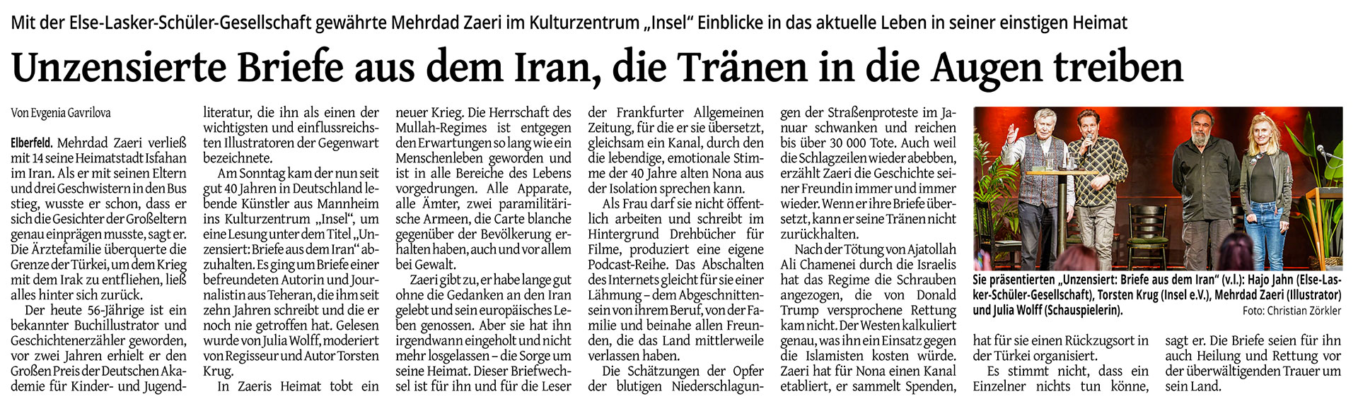 Unzensiert: Briefe aus dem Iran INSEL Lesung und Gespräch Sonntag // 26. April 2026 / 18:00 Uhr // Einlass / 17:30 Uhr Mehrdad Zaeri / Foto © Mehrdad Zaeri Der deutsch-iranische Künstler Mehrdad Zaeri im Gespräch mit Torsten Krug. Es liest Julia Wolff. „Worte helfen nicht. Und doch sind sie alles, was wir haben. Sie formen Handlungen. Und manchmal richten diese Handlungen sich gegen uns – wie Flugkörper aus Sprache, geschossen in den Nachthimmel.“ Die blutig niedergeschlagenen Aufstände der Menschen im Iran liegen schon wieder einige Wochen zurück. Doch die Repressionen in diesem „Gottesstaat“ halten weiter an. Aktuell überschlagen sich die Ereignisse, und diese Veranstaltung bekommt jeden Tag einen neuen, keinesfalls weniger Sinn. Auch zu leiden haben unter der Unfreiheit des Mullah-Regimes Schriftstellerinnen, Filmemacher und andere Künstlerinnen. Was das bedeutet, thematisiert der Deutsch-Iraner Mehrdad Zaeri am 26. April in Wuppertal im Gespräch mit dem Autor und Regisseur Torsten Krug. Die Schauspielerin Julia Wolff liest aus unzensierten, bislang unveröffentlichten Briefen einer persischen Autorin an Mehrdad Zaeri, der ihre eindrucksvollen Texte übersetzt hat: „Meine iranische Freundin ist Autorin und Journalistin. Da sie seit Jahren nicht mehr als schreibende Frau öffentlich arbeiten darf, schreibt sie im Hintergrund Drehbücher für Filme und produziert eine eigene Podcast-Reihe. Wir sind uns in der ‚echten Welt‘ nie begegnet. Seit etwa zehn Jahren schreibt sie mir aus ihrem alltäglichen Leben. Sie lässt mich so das innere wie äußere Leben einer jungen Frau im heutigen urbanen Tehran verstehen. Ich selbst, wohnhaft im demokratischen Deutschland, in Mannheim, bin Buchillustrator, Geschichtenerzähler und Street-Art-Künstler. Gemeinsam mit meiner Frau Christina Laube realisiere ich seit 2016 unter dem Namen DUO SOURATI (persische Bedeutung: Altrosa) großformatige Zeichnungen auf Hausfassaden.“ Der Eintritt ist frei. Es wird um Spenden für die iranische Autorin gebeten. Eine Veranstaltung der Else Lasker-Schüler-Gesellschaft in Kooperation mit der INSEL Mehr Informationen Website der Else-Lasker-Schüler-Gesellschaft Pressebericht // Westdeutsche Zeitung / 28. April 2026 vorheriger Artikel Ich komme von einem Ort, der verwüstet worden ist 539 TAGs: INSELWuppertalLiteraturLesungAutorinTorstenKrugÜbersetzungIranBriefeMehrdadZaeriJuliaWolffPersischAufstandProtest