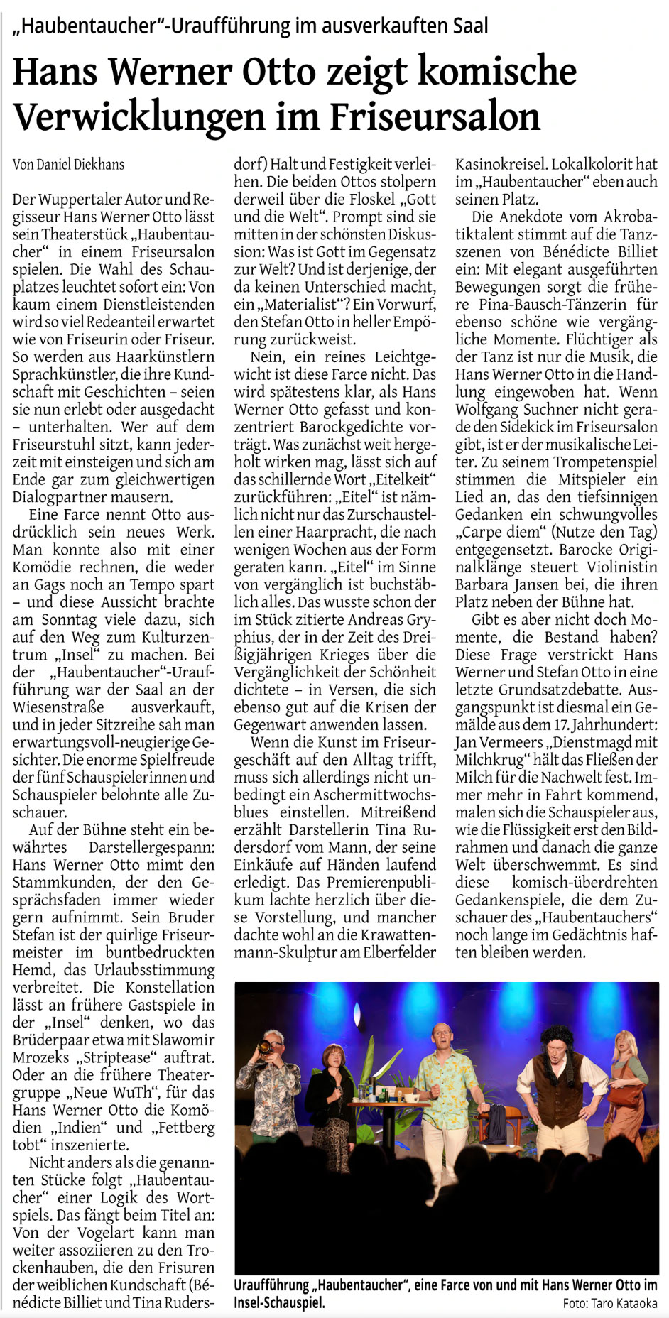 Haubentaucher INSEL Schauspiel Sonntag // 19. April 2026 / 18:00 Uhr Eine Farce von und mit Hans Werner Otto Haubentaucher // Bild / Jan Vermeer // Montage / Zara Gayk Tickets kaufen Mit Hans Werner Otto, Barbara Jansen, Bénédicte Billiet, Tina Rudersdorf, Stefan Otto und Wolfgang Suchner. „Im Frisörsalon gerate ich bekanntlich schnell in ein ganz privates Gespräch. Bei kaum einem Dienst wird vom Leistenden so viel Redeanteil erwartet. Ich gehe nicht nur hin, um mir die Haare schneiden zu lassen – zumal ich kaum noch welche habe –, nein, ich möchte auch gleich noch unterhalten werden. Und ich weiß ja: Frisörin und Frisör verstehen sich darauf, sie haben sich mit den Jahren im Beruf die Fähigkeit erarbeitet, zu jedem Thema etwas beizusteuern, über alles und jeden zu reden – über Alltagsfreuden, Schönheit und Eitelkeit genauso wie über die Krisen der Gegenwart. Wie in der Zeit des Dreißigjährigen Krieges, als die Lyriker des Barocks die Endlichkeit von Wohlstand, Glück und Leben besangen, so wird auch heute immer mehr über unsere Vergänglichkeit gesprochen – also über Gott und die Welt. Und oft stehen mir die Haare zu Berge.“ Pressebericht Westdeutsche Zeitung // 21. April 2026 INSEL Schauspiel Sonntag // 19. April 2026 / 18:00 Uhr HAUBENTAUCHER Eine Farce von Hans Werner Otto Einlass / 17:30 Uhr Eintrittspreis Vorverkauf // EUR 14.00 pro Person / EUR 8.00 erm. Abendkasse // EUR 16.00 pro Person / EUR 9.00 erm. Tickets kaufen vorheriger Artikel GELD – Ein Liederabend 361 TAGs: INSELWuppertalSchauspielFarceHansWernerOttoBarbaraJansenBénédicteBillietTinaRudersdorfStefanOttoWolfgangSuchnerFrisörsalon